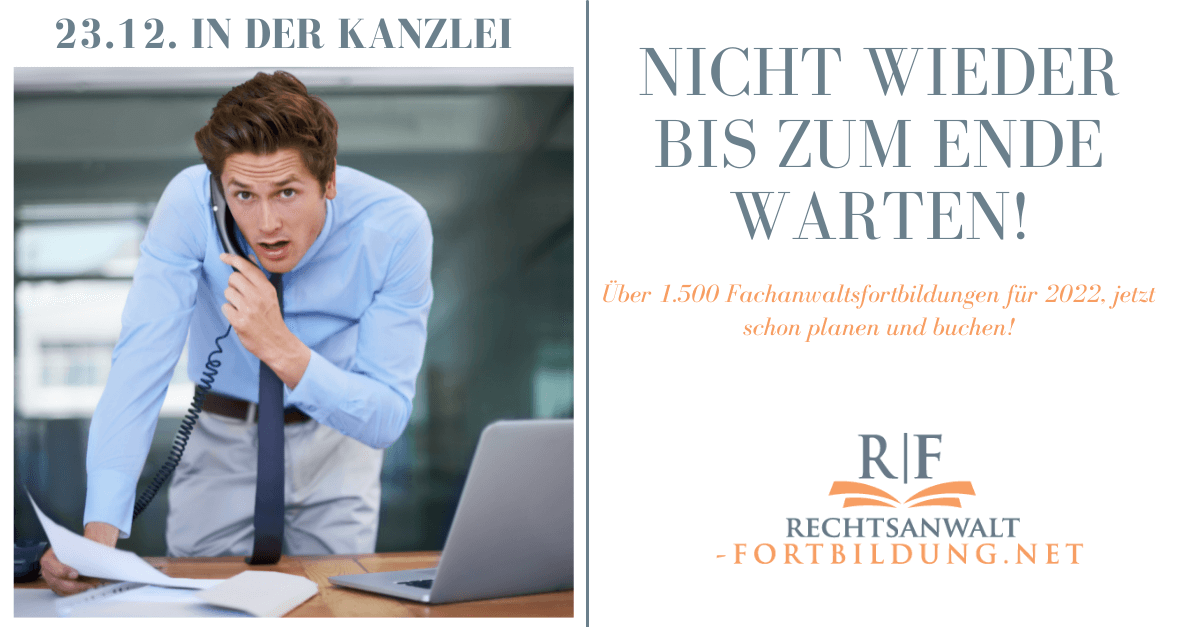 Warten Sie nicht wieder bis das Jahr zu Ende ist. Wir haben bereits jetzt über 1.500 Fortbildungen nach § 15 FAO für Sie im Angebot.