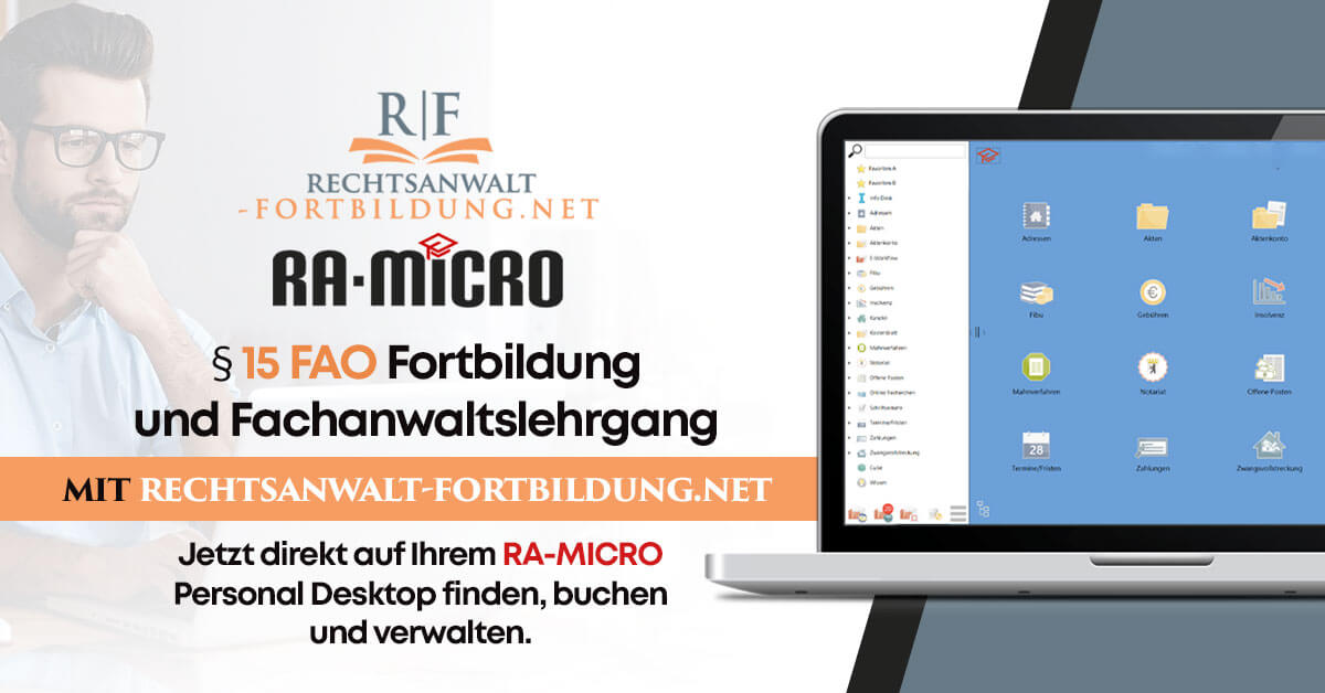 Unser Portal zum Finden, Buchen und Verwalten Ihrer Fachanwaltsfortbildungen erreichen Sie jetzt auch direkt über die RA-MICRO Kanzleisoftware. Unser Angebot bleibt natürlich unabhängig und für Anwälte kostenlos.